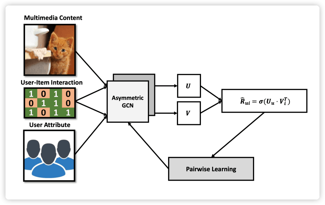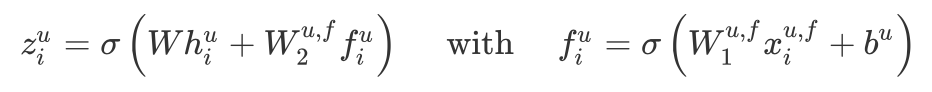 其中 是参数矩阵。对于 items 的 embeddings,只需要将 users attributes 矩阵换成 items 的 feature 矩阵 即可( 即为 multimedia content):