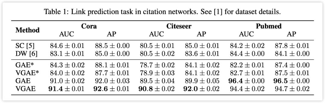 不过,Kipf 和 Welling 在论文中指出,SC 和 DW 不支持 input features,因此能够使用 input features 是 VGAE 的特点之一。
