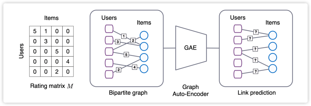 这篇文章提出,matrix completion 任务可以视作为 graph 上的链接预测问题,即 users 和 items 构成了一张二部图,图上的边代表相应的 user 与 item 进行了交互,于是 matrix completion 问题就变成了预测这张二部图上的边的问题。