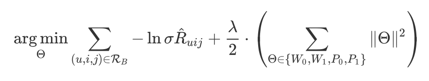 由于 GraphCAR 要解决的是 top-n 推荐问题,因此目标函数选择了 BPR pairwise 目标,即: