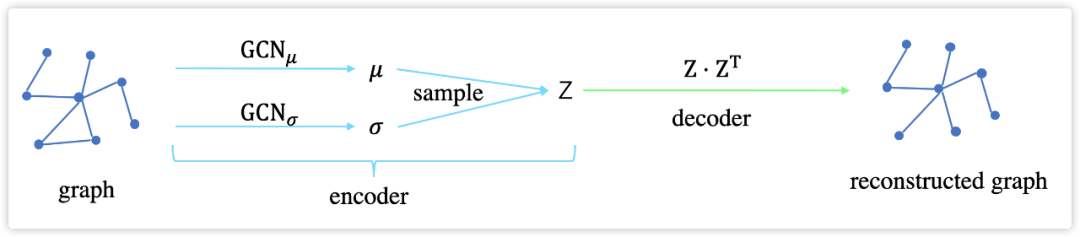 VGAE 的思想和变分自编码器(VAE)很像:利用隐变量(latent variables),让模型学习出一些分布(distribution),再从这些分布中采样得到 latent representations(或者说 embedding),这个过程是 encode 阶段。