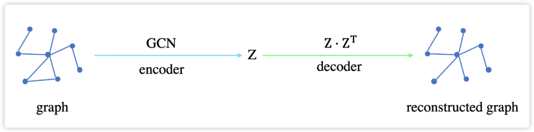 然后再利用得到的 latent representations 重构(reconstruct)出原始的图,这个过程是 decode 阶段。只不过,VGAE 的 encoder 使用了 GCN,decoder 是简单的内积(inner product)形式。