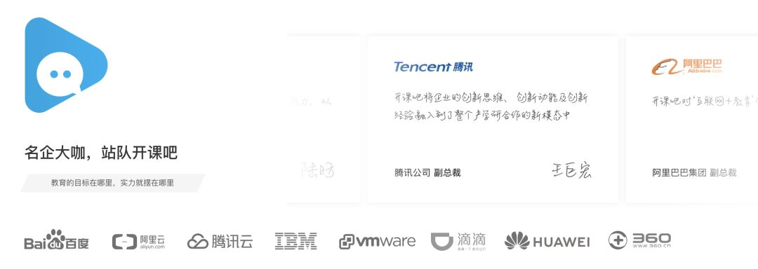 在合作之前,我还特地去看了一下开课吧的官网,吸引我的不仅仅是课程设计、师资力量,更有开课吧与腾讯、阿里、百度、华为等各大名企有着深入合作。