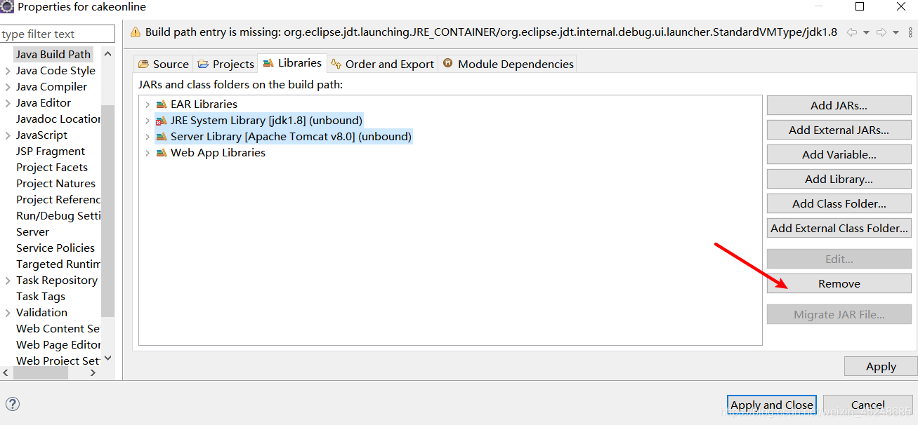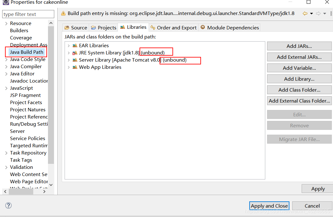 发现JDK和Tomcat都未绑定,这是原先项目的,现在在你的eclipse中,需要绑定你的