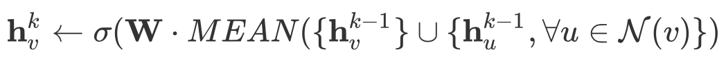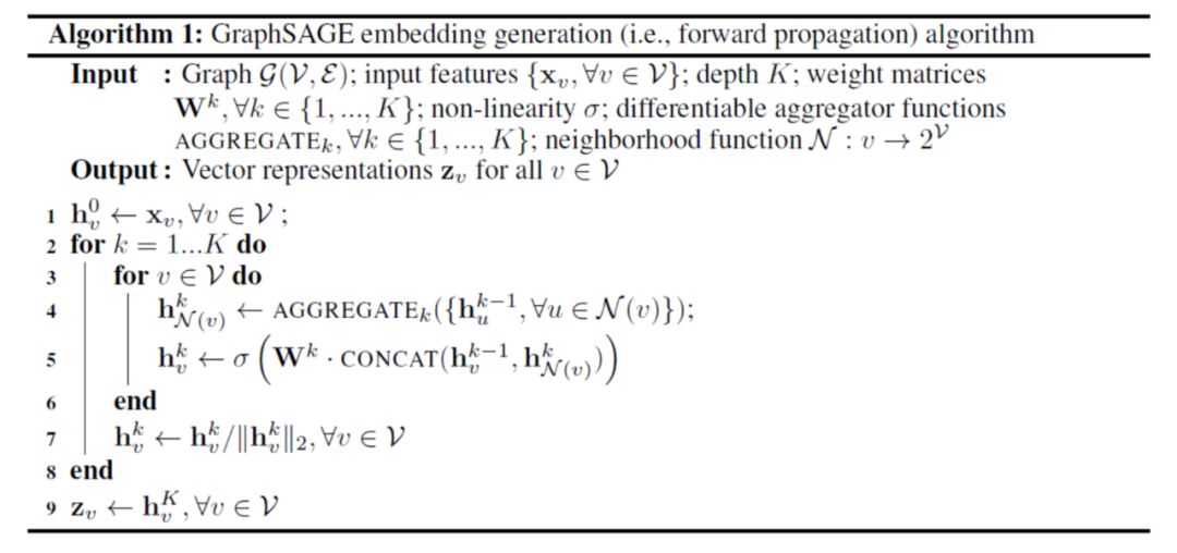 2. 之后进行 K次迭代,在每次迭代中,对每个结点 v,聚合它的邻居结点(采样后)的在上一轮迭代中生成的结点表示 生成当前结点的邻居结点表示