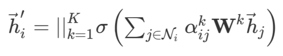 既然得到了上式,那么多头注意力的更新就不言而明了,用 k 个权重系数分别得到新的结点特征之后再拼接就可以了: