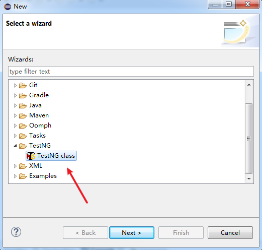 打开Eclipse,File--New--Other,选择"TestNG"--"TestNG Class",如下图说明插件安装成功。