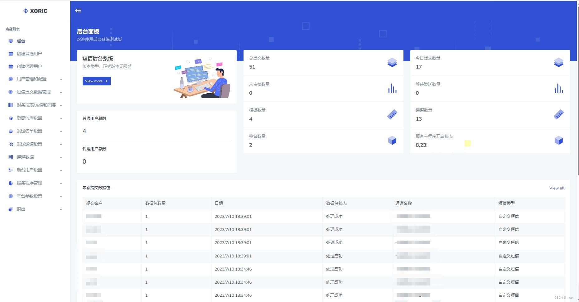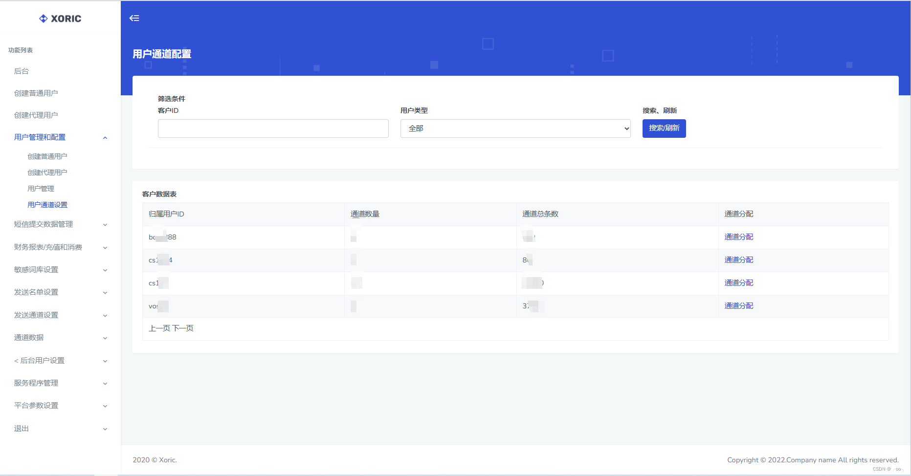 作用:通过用户管理和配置来创建客户和代理商、充值、分配通道等