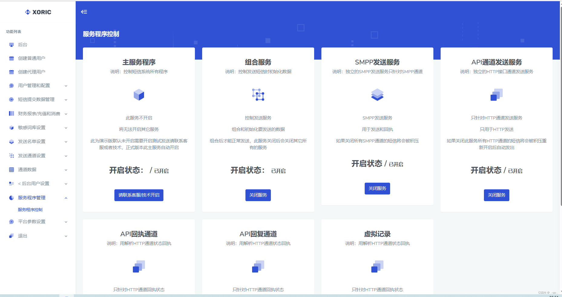 作用:后台的此功能模块 (服务器程序控制)用来通过后台直接控制服务器上的发送组合等相关服务。无需上服务器一个一个关闭。