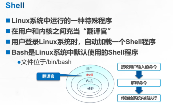 用户通过shell把人的语言转换成计算机语言(二进制语言)传达给内核(也就是系统),内核再调用硬件完成用户的命令。