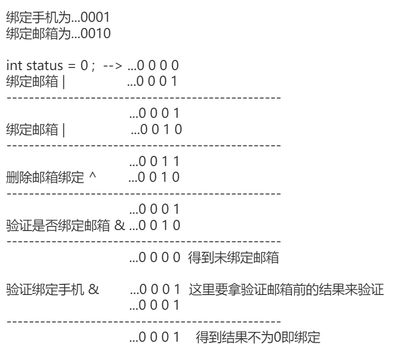 public final static Long BIND_PHONE = 1L << 0; //用户是否绑定了邮箱public final static Long BIND_EMAIL = 1L << 1; // 用户是否实名认证/*** 判断是否绑定值*/public static boolean hasState(long states, long value) {return (states & value) != 0;}/*** 添加状态*/public static long addState(long states, long value) {if (hasState(states, value)) {return states;}return (states | value);}/*** 删除状态*/public static long removeState(long states, long value) {if (!hasState(states, value)) {return states;}return states ^ value;}