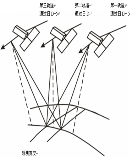 异轨立体观测:异轨立体观测是在不同轨道上获取立体影像。SPOT卫星使用一台扫描仪获取立体影像,该扫描仪的平面反射镜可绕卫星前进方向的滚动轴旋转,从而实现在不同轨道间的立体观测。
