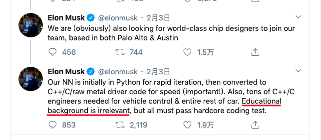 前些时候,马斯克发了一系列的推特,表示特斯拉正在面向社会招聘编程能力出众的人员,尤其是 C 和 C++ 方面的。并且他还明确表示,特斯拉不关心应聘人员的受教育背景:“学历无关紧要”。