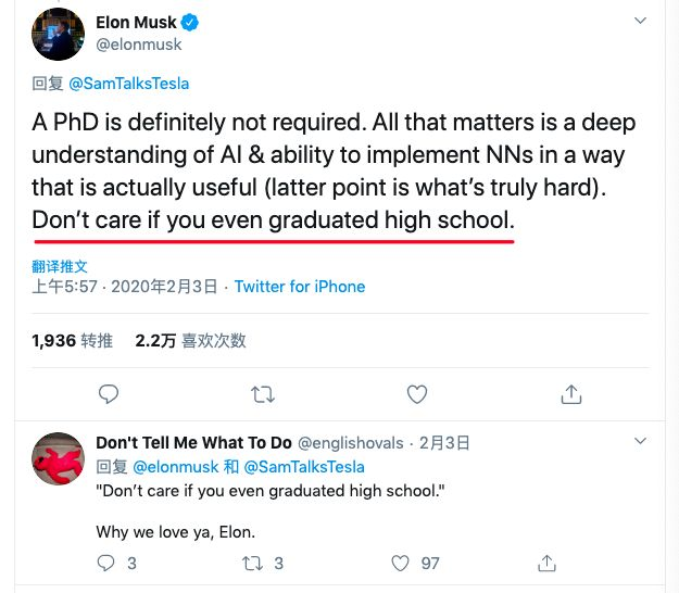 马斯克在 Twitter 上反复表示:“如果没有大学学位,这也不会成为进入特斯拉工作的障碍。”