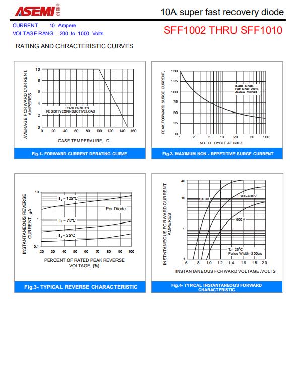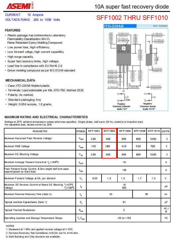 ASEMI品牌SFF1004是采用工艺芯片,该芯片具有良好的稳定性及抗冲击能力,能够持续保证了SFF1004的整流电流稳定在10A,最大反向耐压稳定在400V.