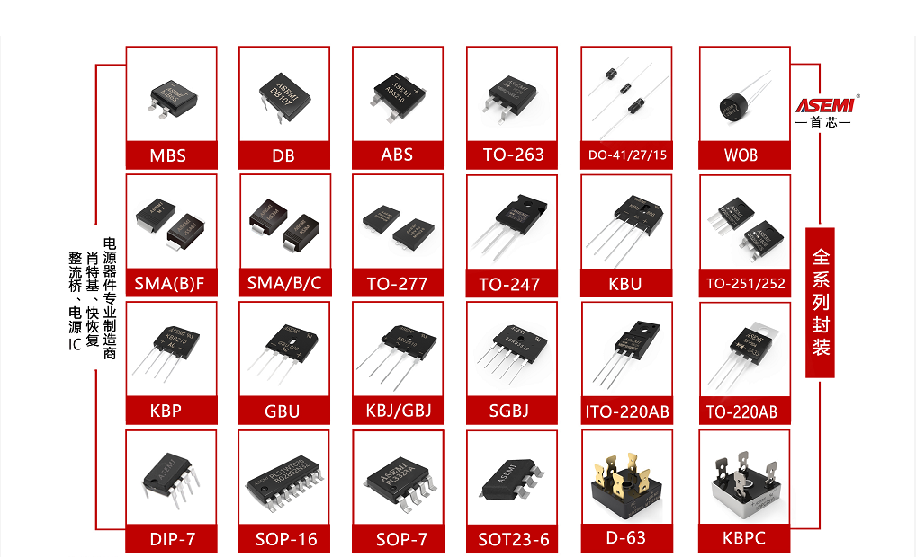 ASEMI半导体厂家-强元芯电子专业经营分离式元器件,主要生产销售整流桥系列封装(DB、WOB、BR、KBPC、KBP、KBPM、GBU、GBL、KBL、KBJ、KBU);整流模块(MDS、MTC、MDQ、QLF、SQLF);汽车整流子(25A~50A STD&TVS Button、Cell、MUR);肖特基二极管TO-220(MBR10100、10150、20100、20150、20200、30100、30200全塑封半塑封);肖特基TO-3P/247,整流二极管(STD、FR、HER、SF、SR、TVS、开关管、稳压管);玻璃钝化(GPP)六英寸晶圆等,各种封装参数在ASEMI官网都有详细介绍。