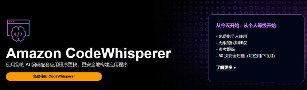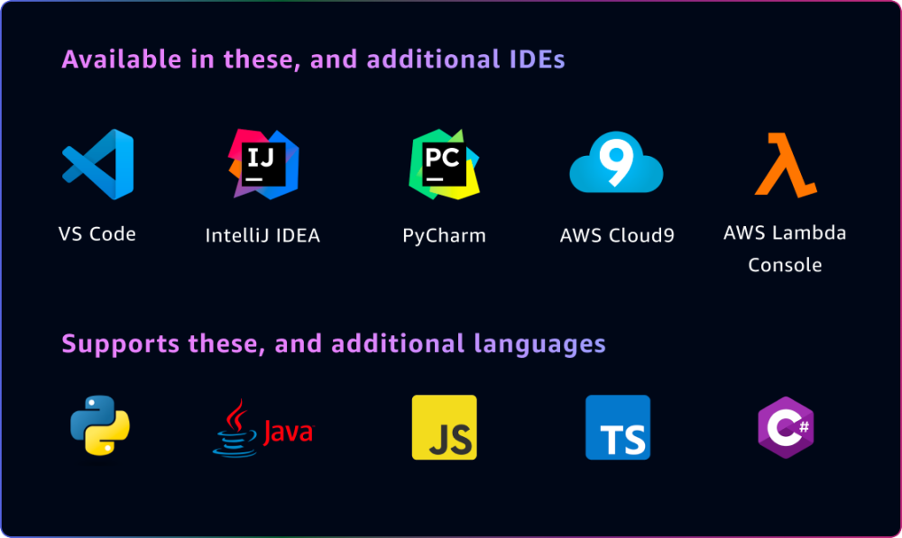 Amazon CodeWhisperer是AI编码的瑞士军刀,支持多达15种编程语言,包括 Python、Java 和 JavaScript,支持多种集成开发环境,包括 VS Code、IntelliJ IDEA、AWS Cloud9、AWS Lambda 控制台、JupyterLab 和 Amazon SageMaker Studio。