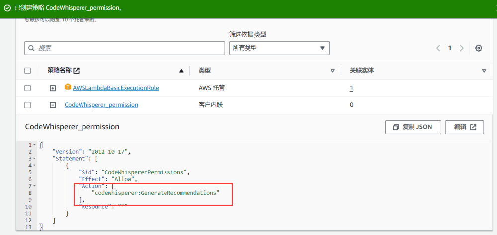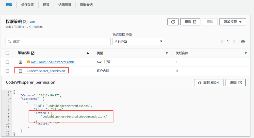 在Cloud9上运行Amazon CodeWhisperer和Lambda一样简单,首先需要保证Cloud9的关联的角色的权限包含codewhisperer:GenerateRecommendations即可(添加内联策略或者新建策略关联到角色即可)