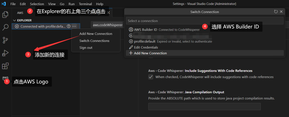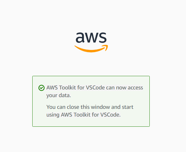 VSCode侧边栏 —> AWS logo —> 新建连接-选择AWS Builder ID —> 按照提示打开浏览器并且登录AWS Builder ID账户/或者新建账户 —> 最终提示 可以关闭窗口