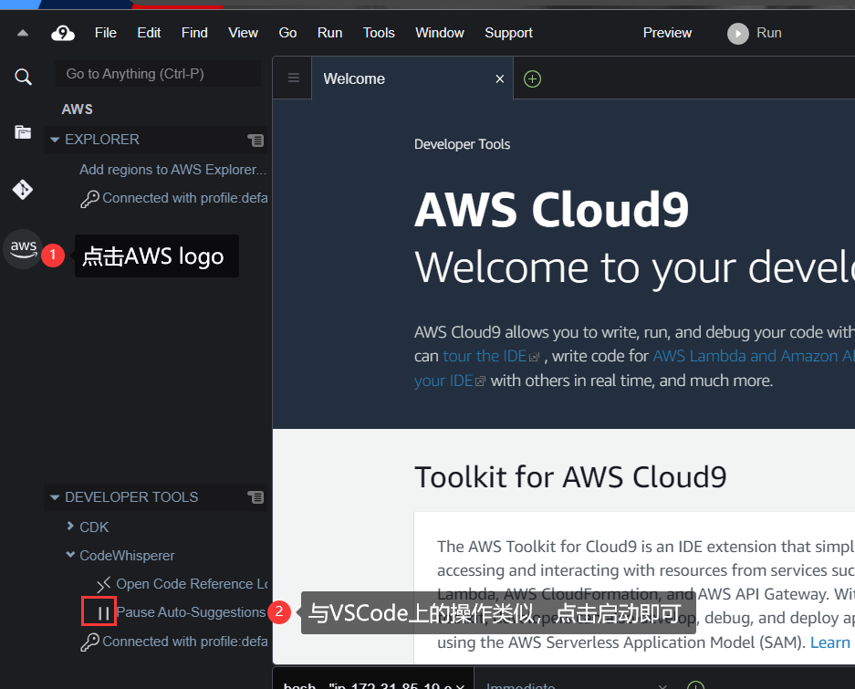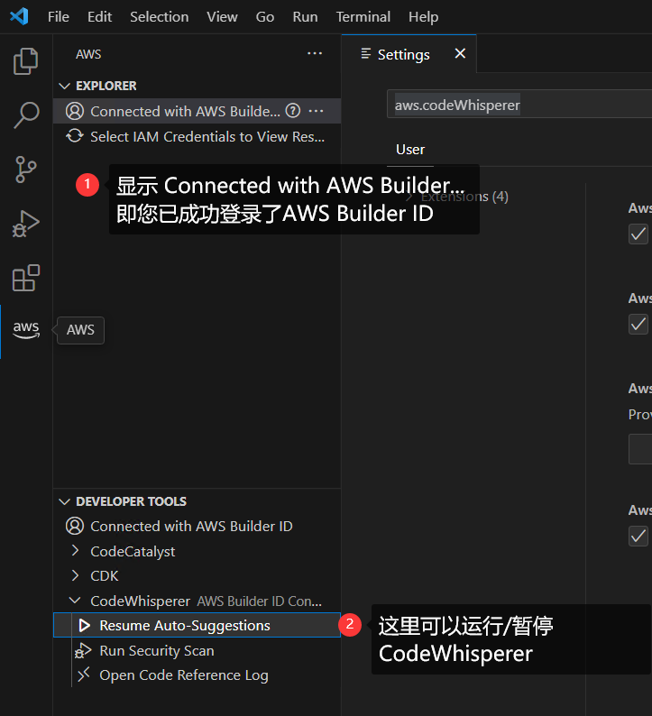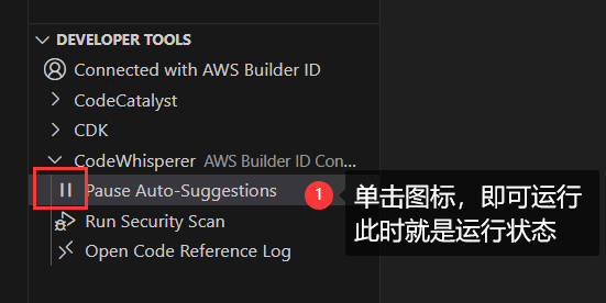 在上一小节的操作中,我们已经成功地在VSCode上连接到了AWS Builder ID,接下来需要做的就是如何使用Amazon CodeWhisperer,如下图,我们已经成功连接上,现在需要运行 CodeWhisperer