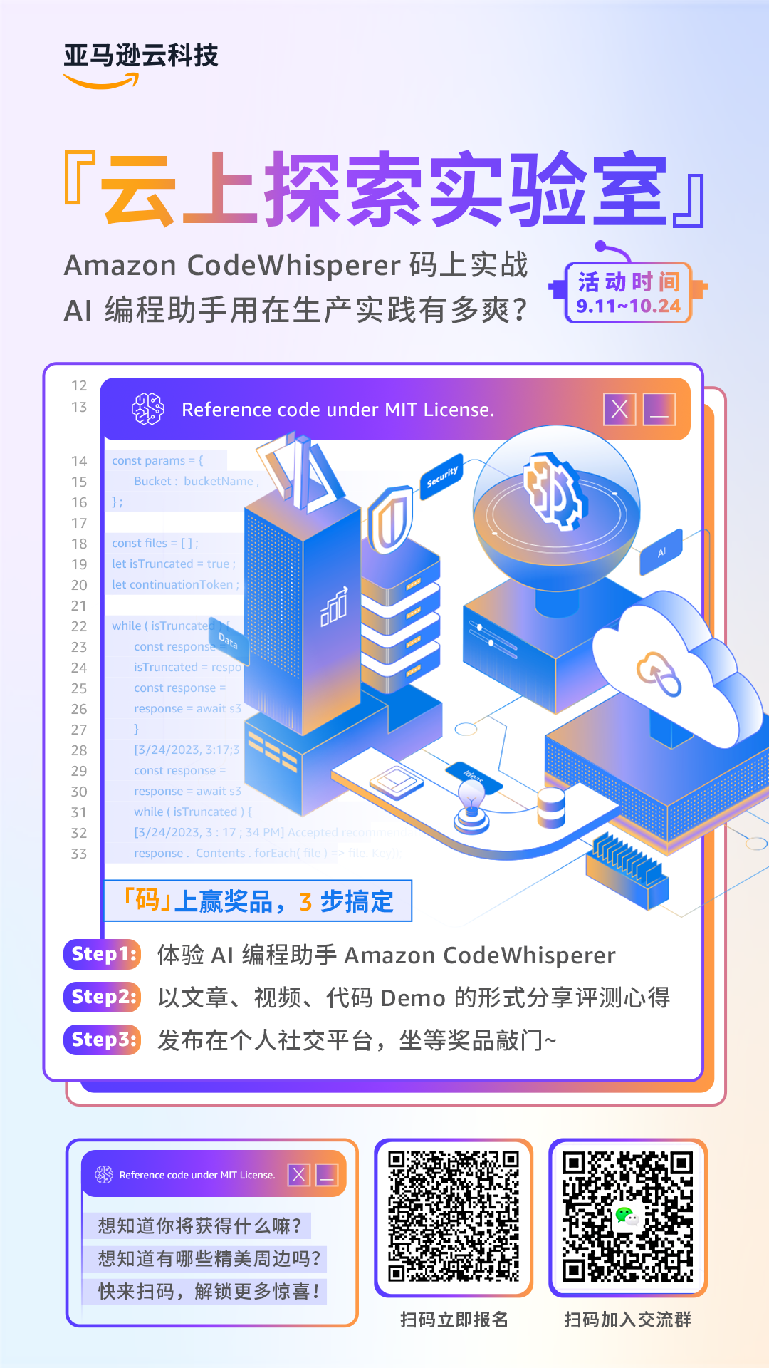 为了让开发者实际体验CodeWhisperer的效率和智能化,亚马逊云科技特别推出了『云上探索实验室』活动。在这里,你可以直接操作CodeWhisperer,看它如何无缝融入到你的开发环境。