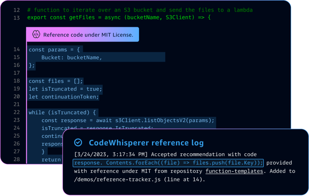 CodeWhisperer 提供内置的引用跟踪器,用于检测代码建议是否可能与开源训练数据相似,并可以标记此类建议。这些建议用开源项目的存储库 URL、文件引用和许可证信息进行注释,因此您可以在决定是否采用建议的代码之前进行查看。您使用的所有已标记的建议都会被记录下来,以便您可以稍后查看并自行决定添加许可证归属。您也可以选择滤除 CodeWhisperer 认为与开源代码相似的所有代码建议。