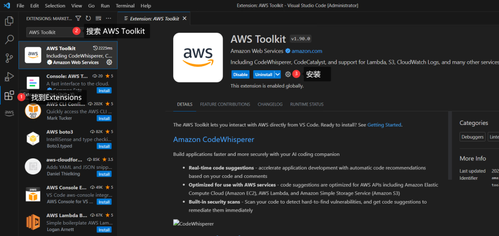 打开VSCode —> 侧边栏Extensions —> 搜索AWS Toolkit —> 进行安装并重启VSCode