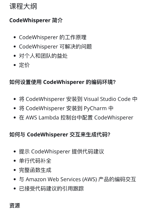 如果说上面的操作是开胃菜,对于爱学习的同学来说,只是刚起了“食欲”,那么下面的就是"可放心食用的每餐",让爱学习的同学们能够真正掌握到CodeWhisperer,在其充分的融入到日常生活和工作中。有人会问,新兴技术的教程,尤其是视频,大多数都是英文,那么英文不好怎么办呢?就算是英语能力很差也没事!全世界都在学中文,亚马逊云科技也很贴心的考虑到这点,所以亚马逊云科技推出的免费学习课程**《Amazon CodeWhisperer 入门(简体中文)》**,同学们是真的可以放心"食用"!对于想吃"生肉"的同学呢,咱们也准备了英文版的供大家学习