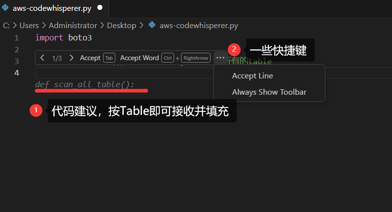 Amazon CodeWhisperer 经过数十亿行 Amazon 和公开可用代码的训练,可以理解用自然语言(英语)编写的评论,可以实时生成多个代码建议以提高开发人员的工作效率。该服务直接在集成式开发环境(IDE)代码编辑器中为完整的函数和逻辑代码块(通常由多达 10–15 行代码组成)提供建议。生成的代码与您编写代码的方式类似,符合您的风格和命名规则。您可以快速接受排在首位的建议(Tab 键)、查看更多建议(箭头键)或继续编写自己的代码。在接受代码建议之前,请务必对其进行审查,并且可能需要对其进行编辑以确保完全符合您的预期。键入时,CodeWhisperer 甚至会自行提供完成注释的建议。