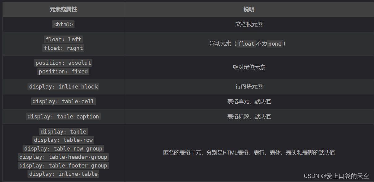 - 可以设置行内块,来防止自身及其他元素被浮动元素覆盖(如果说浮动是“独善其身”,那行内块就有点“兼济天下”的意思)