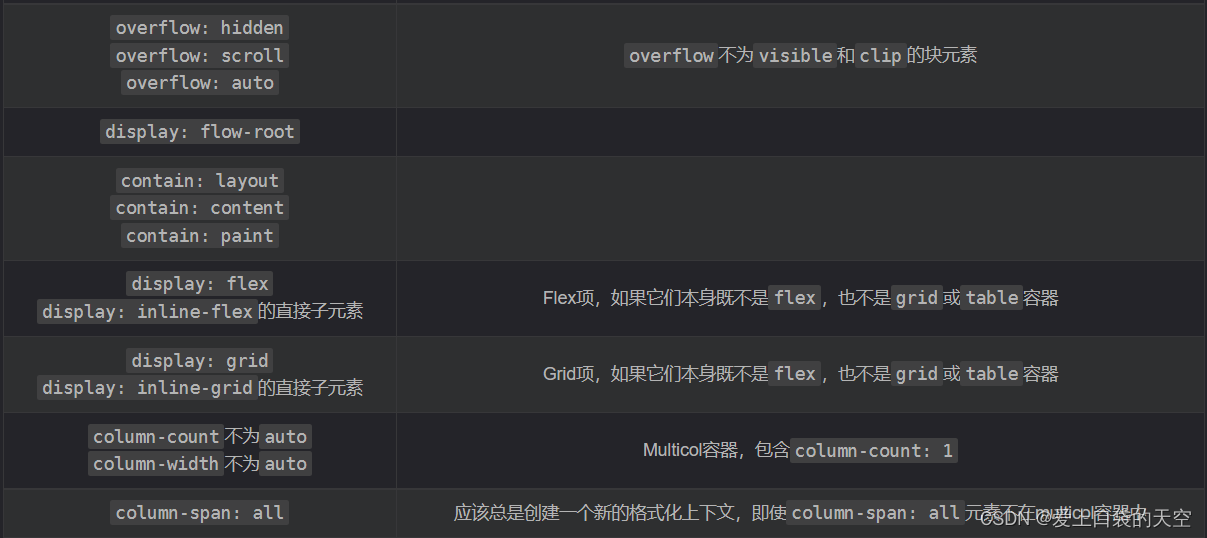 打开Block formatting context模块后,可以看到有很多开启BFC的方式