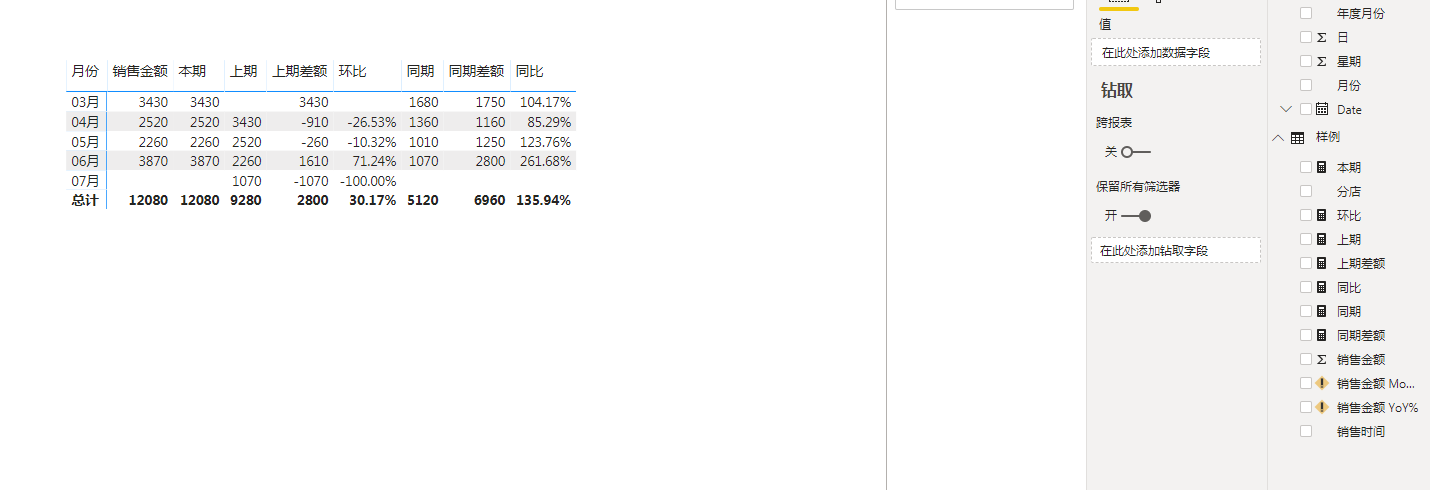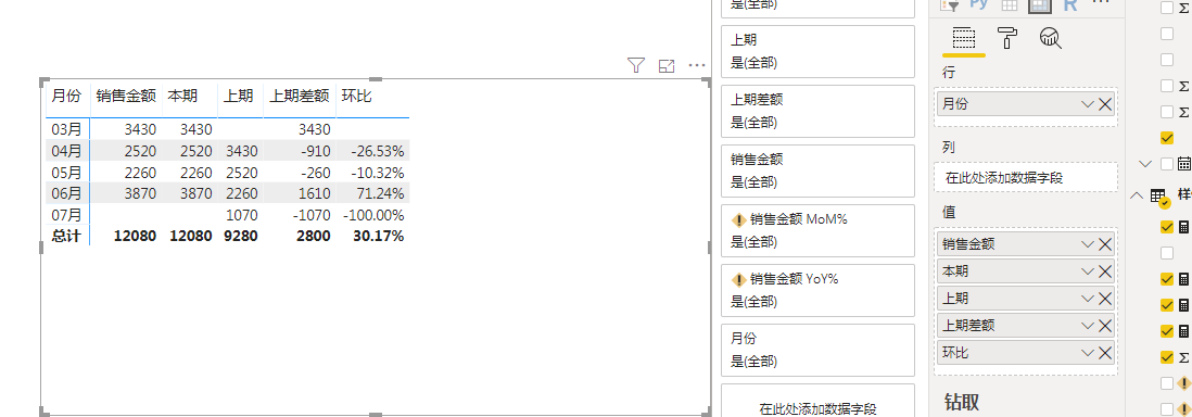 这样看起来是不是顺眼多了,来,接下来我们要开始准备工作了,同比与环比的计算,要准备本期、上期、同期、上期差额、同期差额,这五个度量值,具体公式如下。