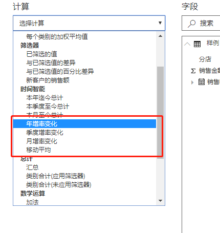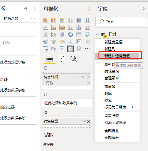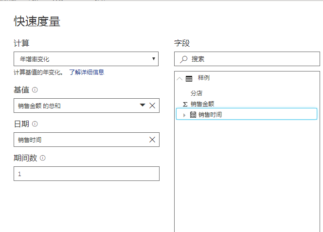 下面就可以准备进行同比环比的测试了,白茶在初期的时候,发现系统默认的快速度量值,可以选择计算同比、环比,如下图: