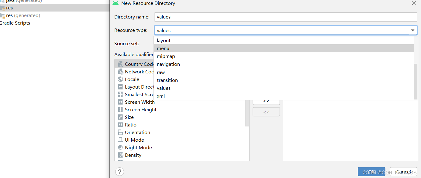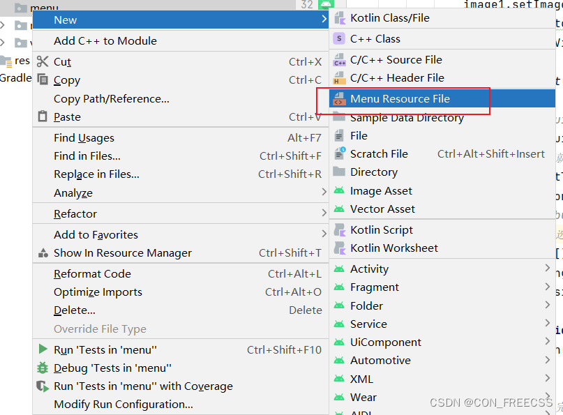 (1).手动创建菜单资源文件--res-->右键选择Menu Resource Dictionary-->资源类型选择menu-->menu文件右键创建Menu Recource File。
