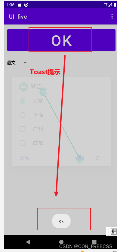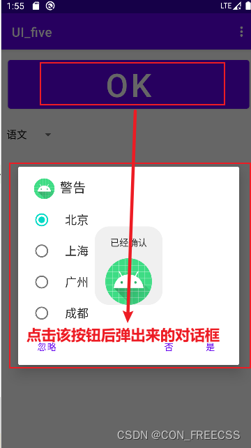 public class MainActivity extends AppCompatActivity {Button btnok;@Overrideprotected void onCreate(Bundle savedInstanceState) {super.onCreate(savedInstanceState);setContentView(R.layout.activity_main);btnok=findViewById(R.id.btnok);@Overridepublic void onClick(View view) {//1.应该先创建Builder对象AlertDialog.Builder builder=new AlertDialog.Builder(MainActivity.this);//最简单是提示框就是这四个部分,图标、标题,按钮,内容builder.setTitle("警告");builder.setIcon(R.mipmap.ic_launcher);// 普通对话框 builder.setMessage("是否退出系统");//单选对话框、多选对话框final String []city={"北京","上海","广州","成都"};builder.setSingleChoiceItems(city,0,null);builder.setPositiveButton("是", new DialogInterface.OnClickListener(){@Overridepublic void onClick(DialogInterface dialogInterface,int i){finish();}});//注意构造器构造完成后,不要忘记使用create构造dialogbuilder.setNegativeButton("否",null);builder. setNeutralButton("忽略",null);AlertDialog dialog=builder.create();dialog.show();}});