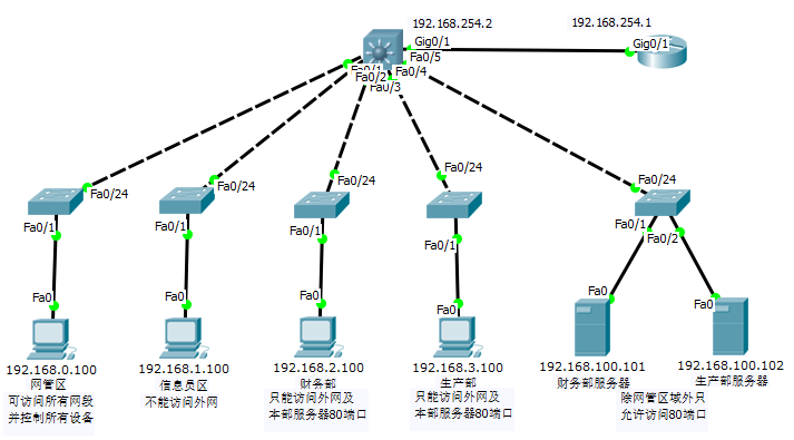 (1)Access-list 101 deny ip 192.168.2.0 0.0.0.255 host 192.168.100.102(阻止财务部访问生产部服务器)