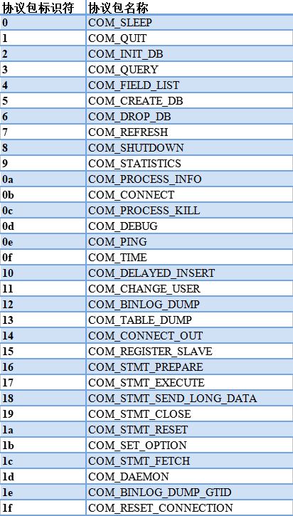 协议包消息体中的首位用于标识命令类型。协议包根据名称即可望文生义,在这里无需一一解释它们的具体用途,下文会解析几个重点的MySQL命令协议包: