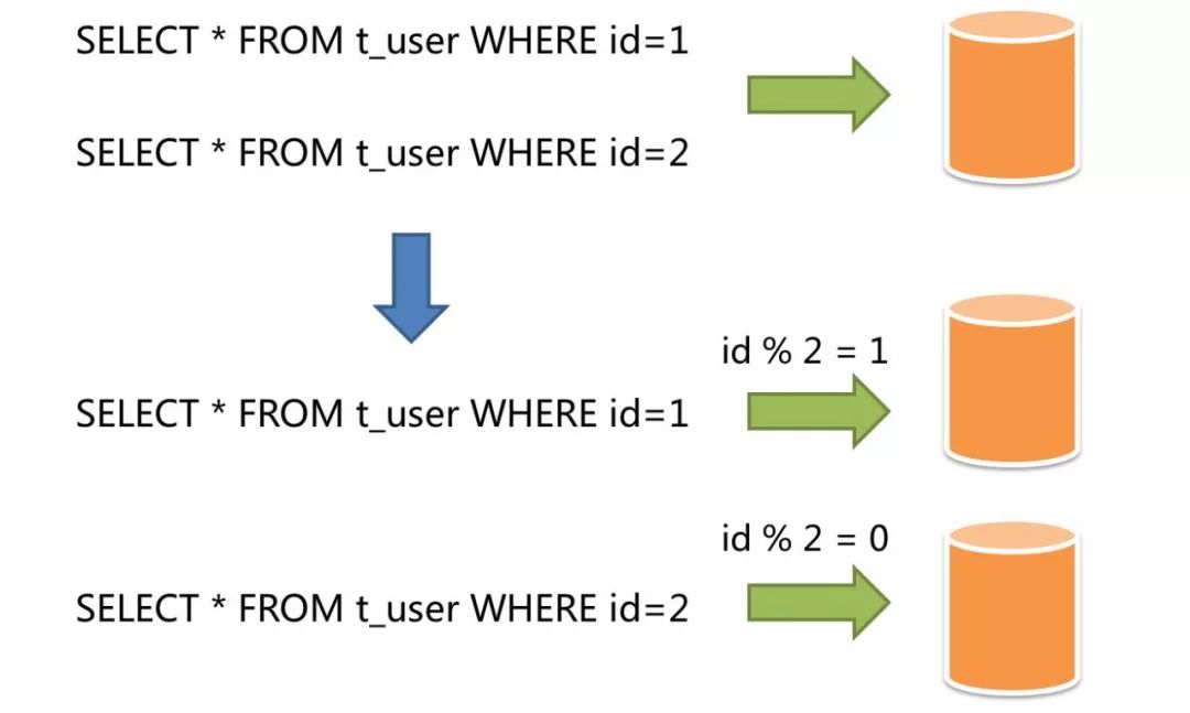 例如,根据ID的最后一位以10取余,尾数是0的放入0库(表),尾数是1的放入1库(表)。如图:
