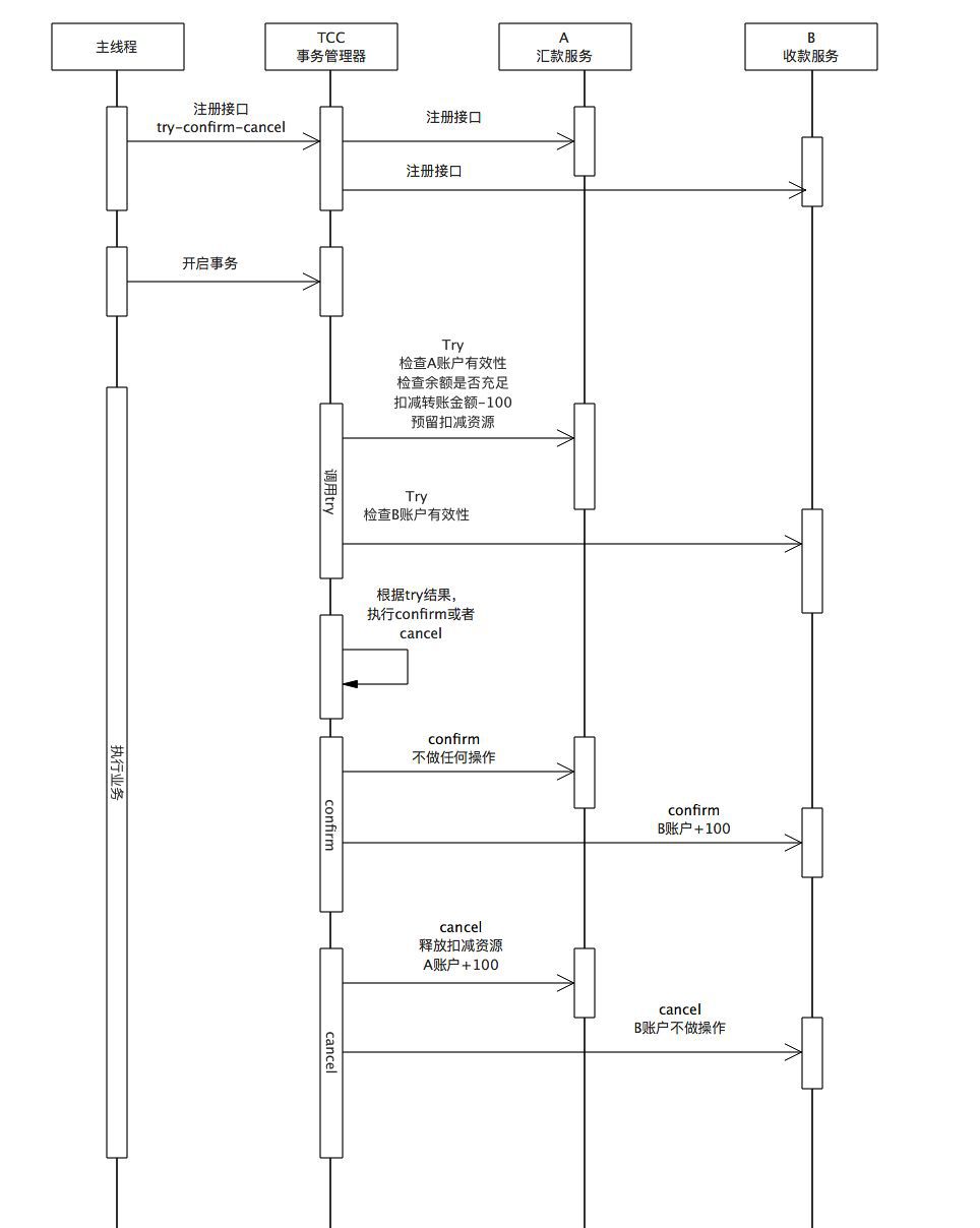 汇款服务和收款服务分别需要实现,Try-Confirm-Cancel接口,并在业务初始化阶段将其注入到TCC事务管理器中。