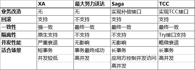 总的来说,基于ACID的强一致性事务和基于BASE的最终一致性事务都不是银弹,只有在最适合的场景中才能发挥它们的最大长处。详细对比一下它们之前的区别,以帮助开发者进行技术选型。由于消息驱动与业务系统的耦合度较高,因此不列入对比表格: