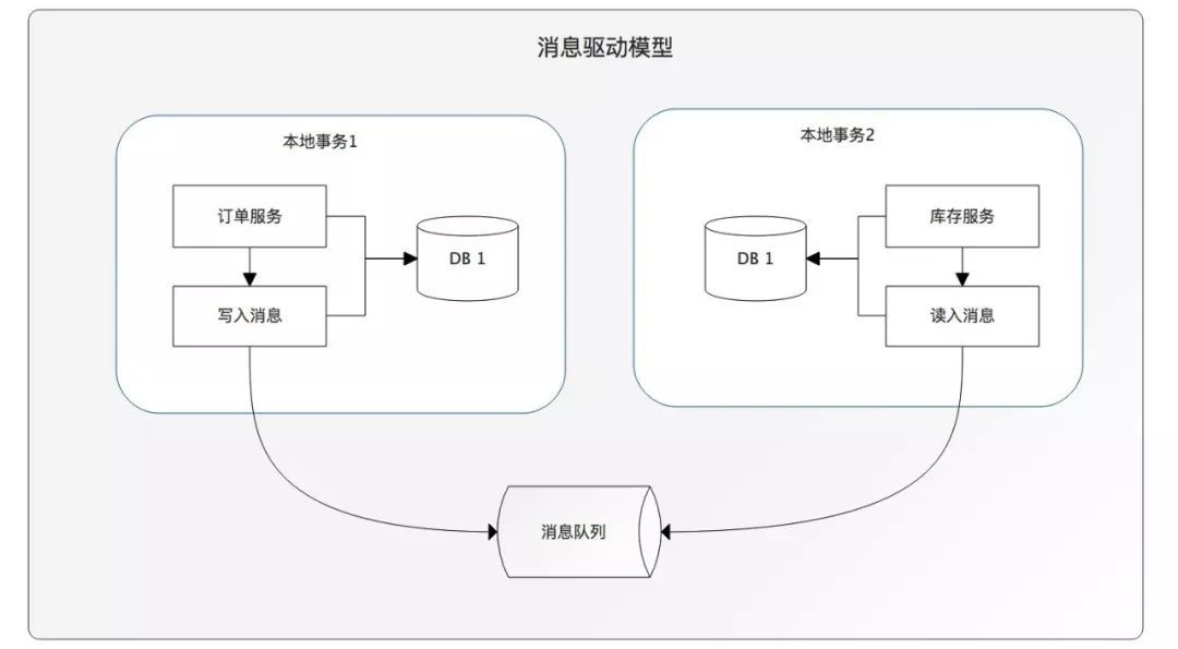 消息一致性方案是通过消息中间件保证上下游应用数据操作的一致性。基本思路是将本地操作和发送消息放在一个本地事务中,下游应用向消息系统订阅该消息,收到消息后执行相应操作。本质上是依靠消息的重试机制,达到最终一致性。下图是消息驱动的事务模型: