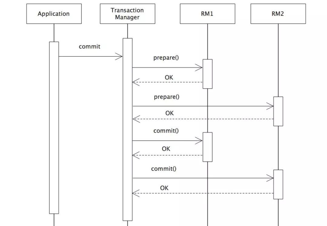 二阶段提交是XA协议的标准实现。它将分布式事务的提交拆分为两阶段:prepare和commit/rollback。