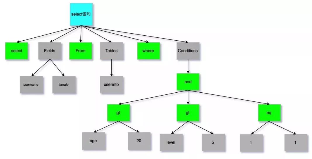 将SQL:select username, ismale from userinfo where age > 20 and level > 5 and 1 = 1解析为抽象语法树: