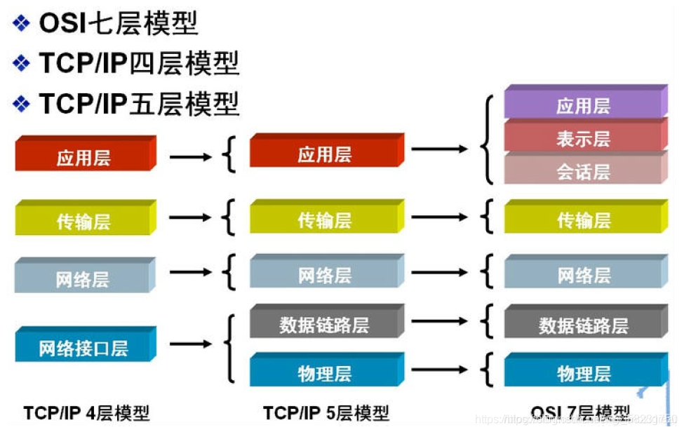 TCP/IP参考模型是首先由ARPANET所使用的网络体系结构。这个体系结构在它的两个主要协议出现以后被称为TCP/IP参考模型。TCP/IP模型原为四层,而TCP/IP五层模型实际上是TCP/IP与OSI七层模型的混合后的产物。说到底,这些模型的出现目的是为了使大家都使用统一的协议(通信规则)来通信。它们之间的对应关系如下图: