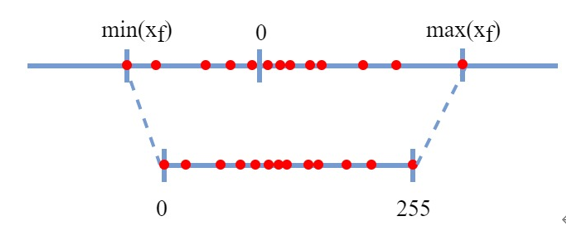 量化可以分为对称量化以及非对称量化两种,以8bit量化为例子,比如我们是要非对称量话,那就是把我们原来的值映射到0-255区间,最小的对应0,最大的对应255. 如果需要对称量化,那么就是首先,找到数据中绝对值最大的数,将数据区间扩充为-max-max之间,对应的是-128-127如图: