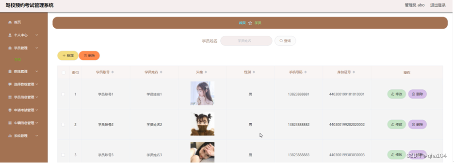 学员管理,在学员管理页面,可以对学员账号、学员姓名、头像、性别、手机号码、身份证号等内容进行修改、删除或新增等操作,学员管理页面如图5-10所示。