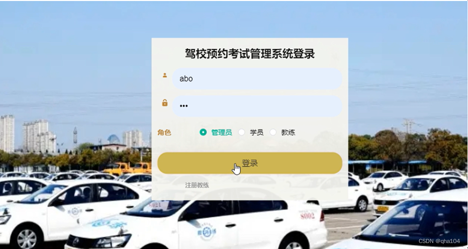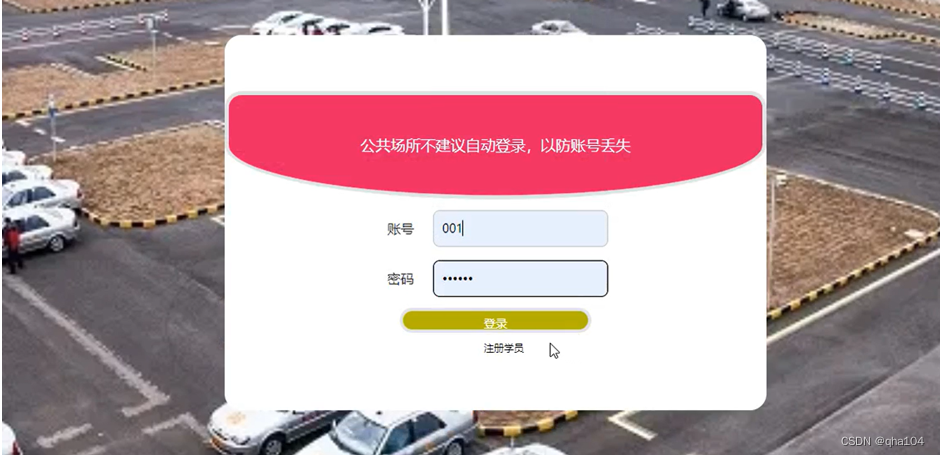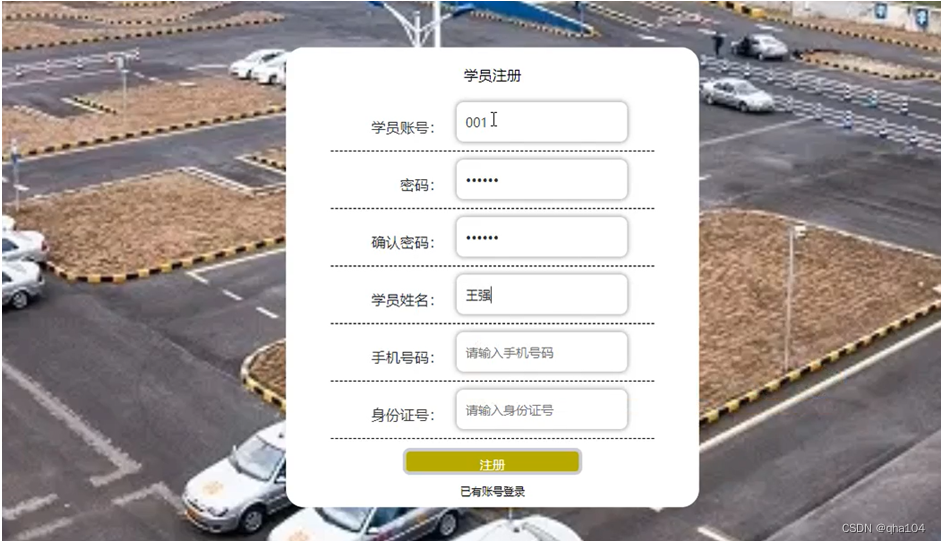 学员注册,在学员注册页面通过输入学员账号、密码、确认密码、学员姓名、手机号码、身份证号等信息完成学员注册操作,如图5-1-1所示;学员通过输入账号、密码,点击登录即可进入到系统前台,进行相应操作,如图5-1-2所示。