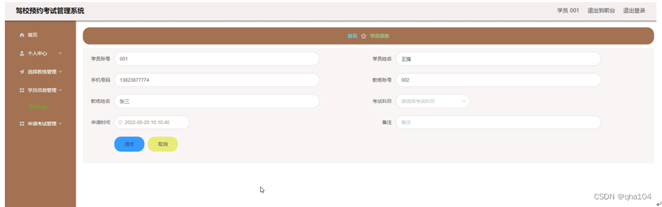 在学员信息管理页面,学员可以查看学员信息详情,并进行修改或申请考试的操作;点击申请考试,学员通过输入学员账号、学员姓名、手机号码、教练账号、教练姓名、考试科目、申请时间、备注等信息,点击提交进行申请考试的操作,学员的考试申请,需要教练在后台进行审核,学员信息管理及申请考试页面如图5-7(1)和5-7(2)所示。