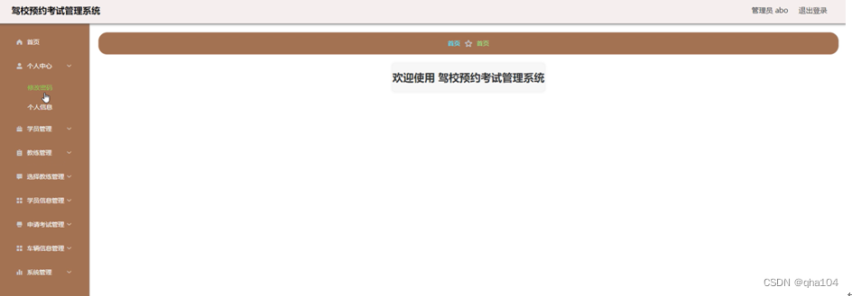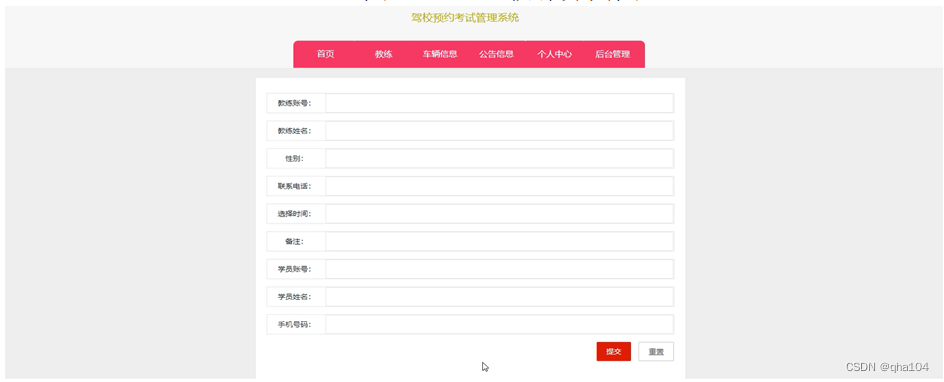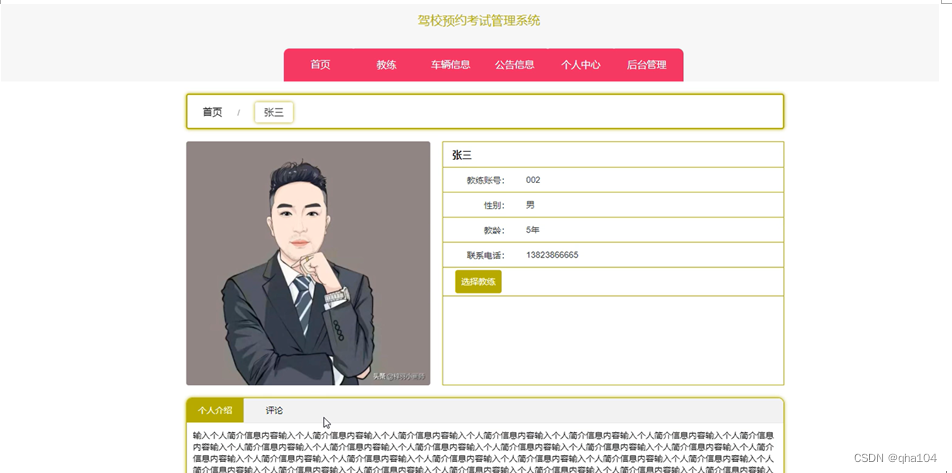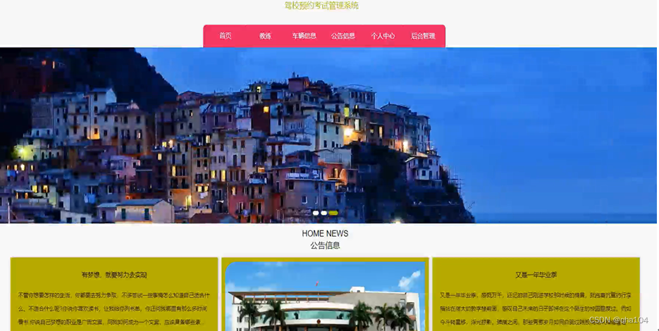 用户登录到驾校预约考试管理系统前台,可以查看首页、教练、车辆信息、公告信息、个人中心、后台管理等内容,并进行相关操作,系统首页如图5-2所示。