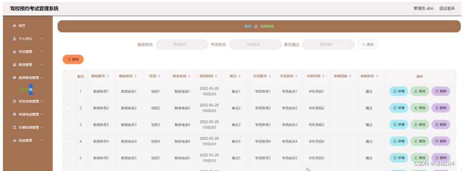 选择教练管理,在选择教练管理页面可以查看教练账号、教练姓名、性别、联系电话、选课时间、备注等信息,并进行修改、删除或查询等操作,选择教练管理页面如图5-12所示。